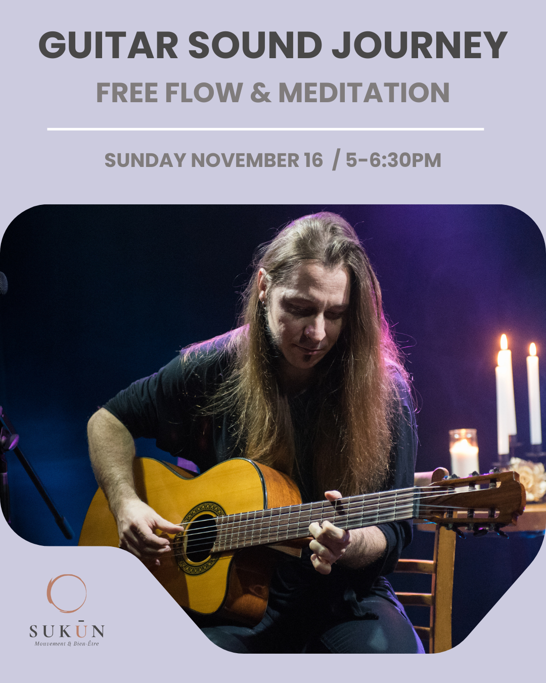 Une pratique libre dans un voyage musical, guidé par le musicien Elma Niacci, pour s’ancrer et traverser la saison sombre. Que ce soit en explorant vos mouvements à travers les différents thèmes musicaux, ou simplement en méditant, en posture assise ou allongée, vous pourrez explorer le pouvoir introspectif de la musique, en laissant les mélodies, les notes et sons de guitare vous faire voyager à l’intérieur de vous-même. Elma Niacci for a unique sound journey — a space to ground yourself and move through the dark season. Whether flowing with your own yoga movements, or resting in stillness and meditation, let the melodies and textures of the guitar carry you inward. This is an invitation to pause, breathe, and explore the deep introspective power of sound — a voyage both soothing and transformative.