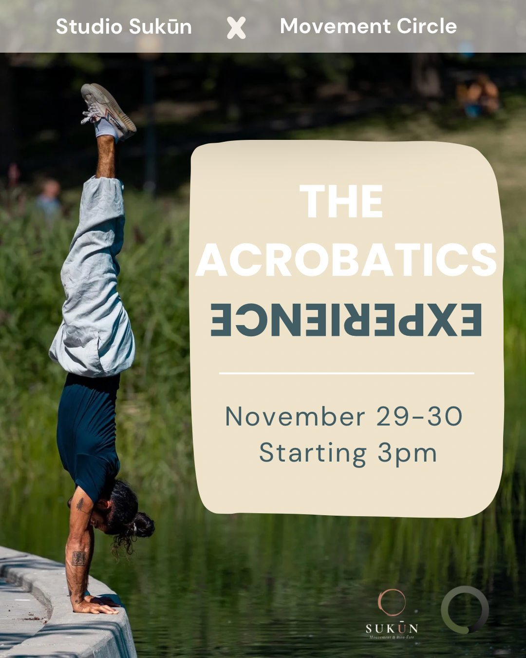 Rejoignez-nous pour deux jours d’ateliers d’acrobaties en collaboration avec The Movement Circle Montreal ! Découvrez votre potentiel dans l’instant présent en explorant les équilibres sur les mains, l’acrobatie en duo et des séquences de mouvement créatives. Cette expérience transforme une pratique intimidante en un voyage de découverte de soi, de confiance et de jeu. Que vous soyez débutant en acrobaties ou que vous souhaitiez perfectionner vos compétences, vous repartirez plein d’énergie, connecté et inspiré à continuer de bouger.